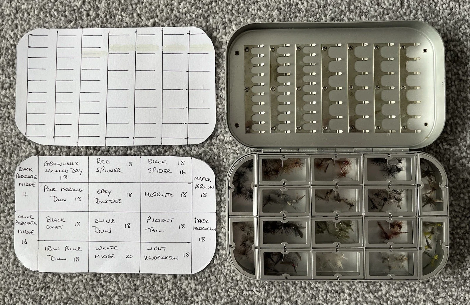 The product is a Richard Wheatley fly box containing 75 Fulling Mill dry flies specifically designed for fly fishing for trout. The brand Richard Wheatley is known for producing high-quality fishing equipment, making this product a valuable addition to any fishing enthusiast's collection. The dry flies included in the box are hook sized 16 to 20 marked on the paper description provided and fly name.