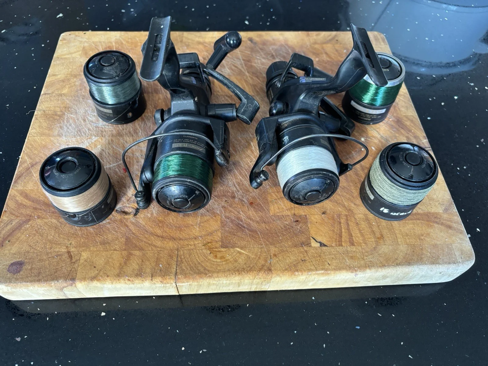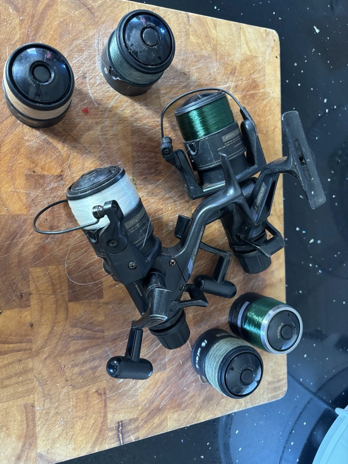 Pair of Shimano Aero GT 3500 bait runner reels with 4 spare spools, in good working condition, a few marks but generally good